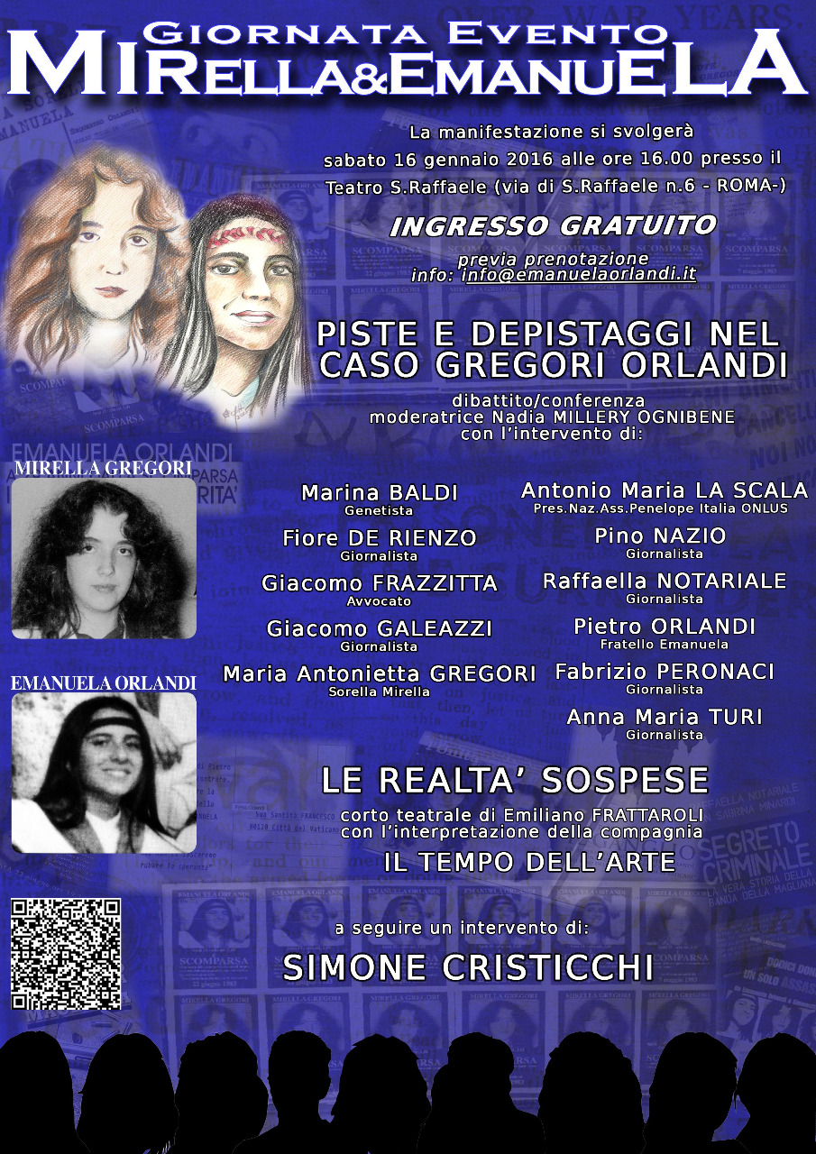 Solidarietà, speranza e rinnovata di “archiviazione del caso”. Archiviazione che, purtroppo, è arrivata. Malgrado questo, abbiamo voluto dimostrare solidarietà alle famiglie e portare avanti il progetto intitolandolo “Giornata Evento Mirella&Emanuela” e invitando vari professionisti che si sono occupati del “caso”. E’ la prima volta che riusciamo ad avere contemporaneamente sul palco tutti questi ospiti. Tengo a sottolineare che tutti i partecipanti (organizzatori, relatori, ospiti, personale dello staff) si sono resi disponibili gratuitamente. Nessuno di loro percepirà gettoni di presenza, rimborsi spesa o riconoscimenti economici di qualsiasi genere. La manifestazione è a ingresso libero e gratuito. Per motivi organizzativi chiediamo a coloro che volessero partecipare di compilare l’apposito modulo che troverete sulla pagina facebook “Giornata evento Mirella&Emanuela”. Naturalmente potranno prendere parte alla manifestazione anche coloro che si recheranno direttamente in loco. Ulteriori informazioni sono presenti sul sito www.emanuelaorlandi.it”.